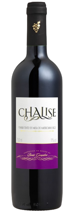 Chalise Tinto Seco. Vinho elaborado a partir de variedade de uvas, Isabel, Concord e Seibel, muito cultivadas na França, Estados Unidos e Brasil. Límpido, com coloração roxo vivo, reflexos violáceos, aroma característico de morango e framboesa, sabor suave e de grande permanência. Conteúdo 750ml. Vinho de Mesa Nacional.